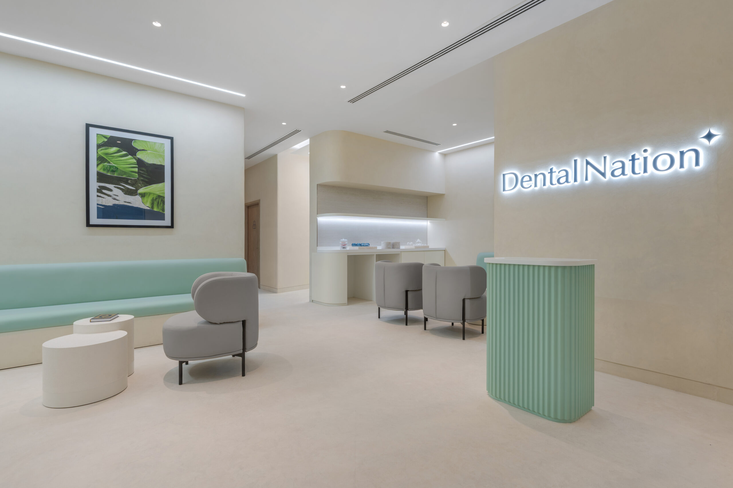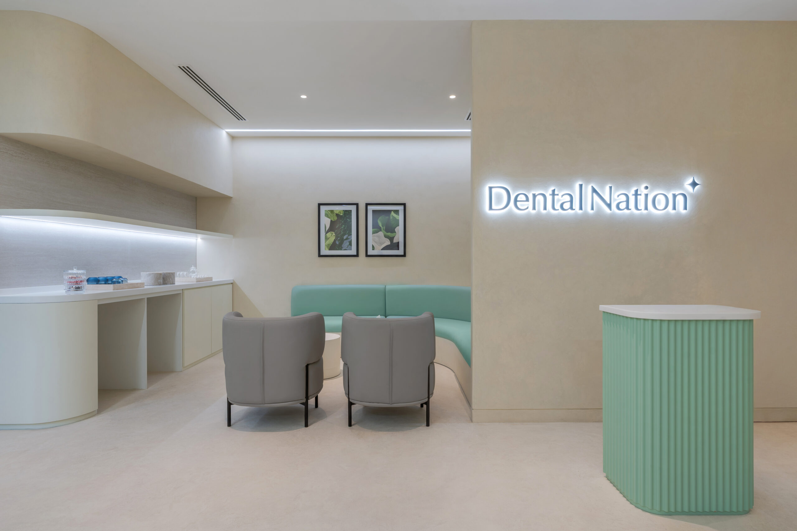 The waiting area at Dental Nation rejects the sterile formality of traditional clinics. Instead, it features layered spaces: an organic seating arrangement, a dedicated children’s area in soft neutrals and greens, and a discrete retail corner showcasing dental wellness products.