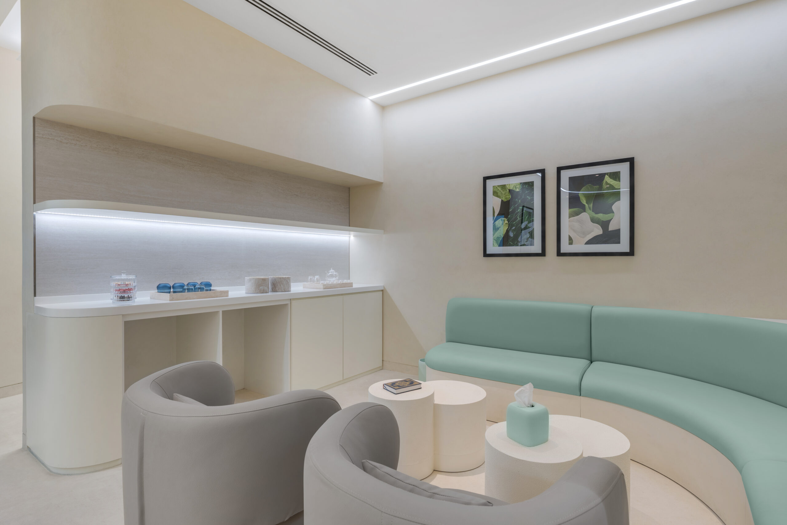 Each dental room was crafted to reduce stress and enhance patient confidence. Soft hues of green, natural oak finishes, and warm integrated lighting set the tone. Artwork, suspended lights, and strategically placed screens create an environment that feels less clinical and more curated. Lighting under counters and above the treatment chairs ensures both functionality for practitioners and psychological ease for patients. The design brings a spa-like feel to dentistry—quieting fears and building trust.