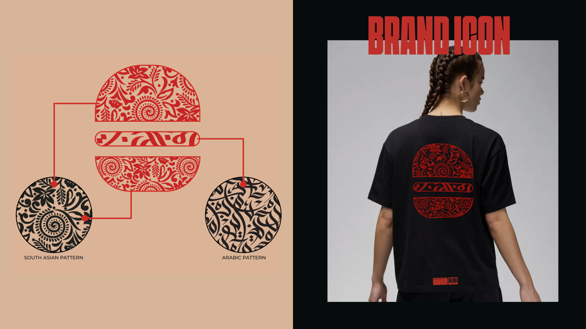The Burger Bliss brand icon represents the idea of cultures coming together, visually forming the perfect “burger.” Each layer symbolizes the blending of global influences that define the UAE’s multicultural spirit. We used the brand pattern to shape the burger’s bun and patty, merging South Asian and Arabic motifs into one cohesive form. This approach transforms a simple burger into a symbol of community and craft, where design becomes a storytelling tool.