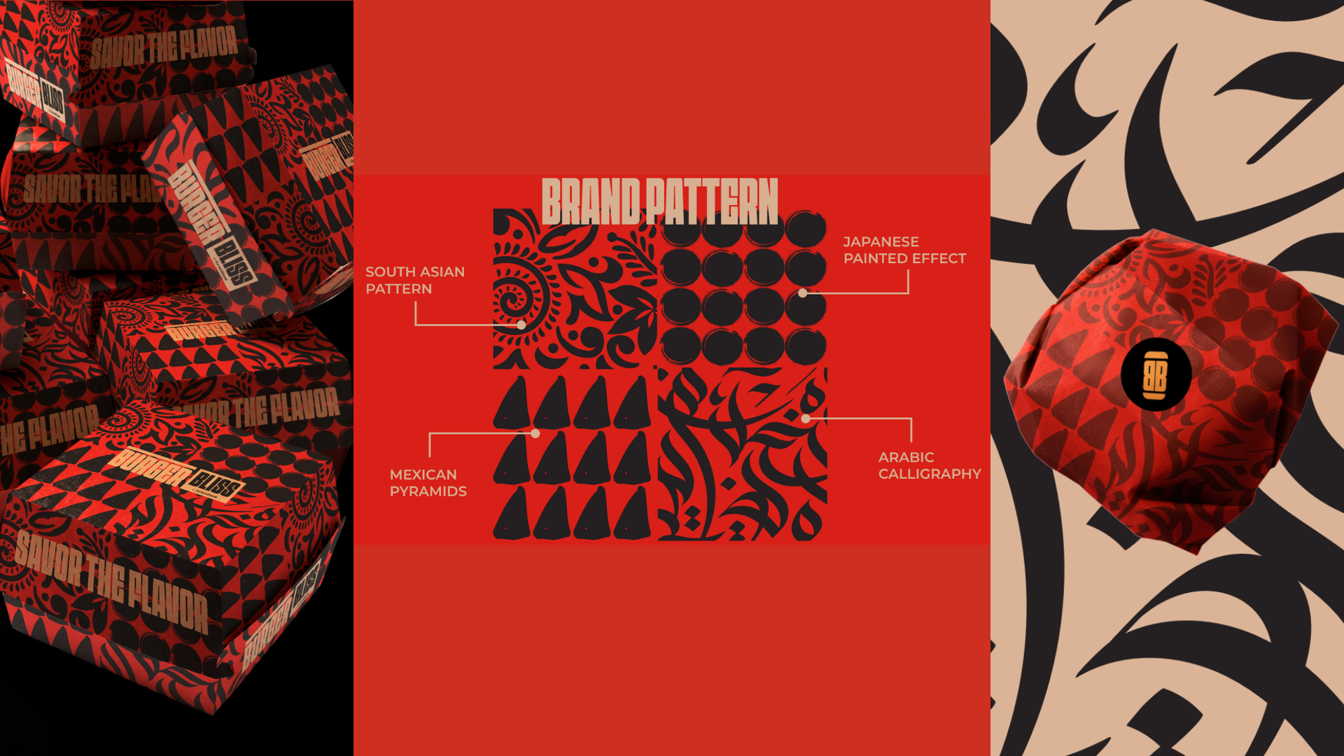 The brand pattern for Burger Bliss was inspired by the UAE’s global community, a melting pot of cultures, stories, and flavors that come together at the table. Rooted in the concept of “Global Community,” the pattern reflects the brand’s mission to unite people through shared moments. Drawing from South Asian patterns, Japanese painted effects, Arabic calligraphy, and Mexican pyramids, we created a fusion of global influences that celebrates diversity while feeling contemporary and handcrafted.