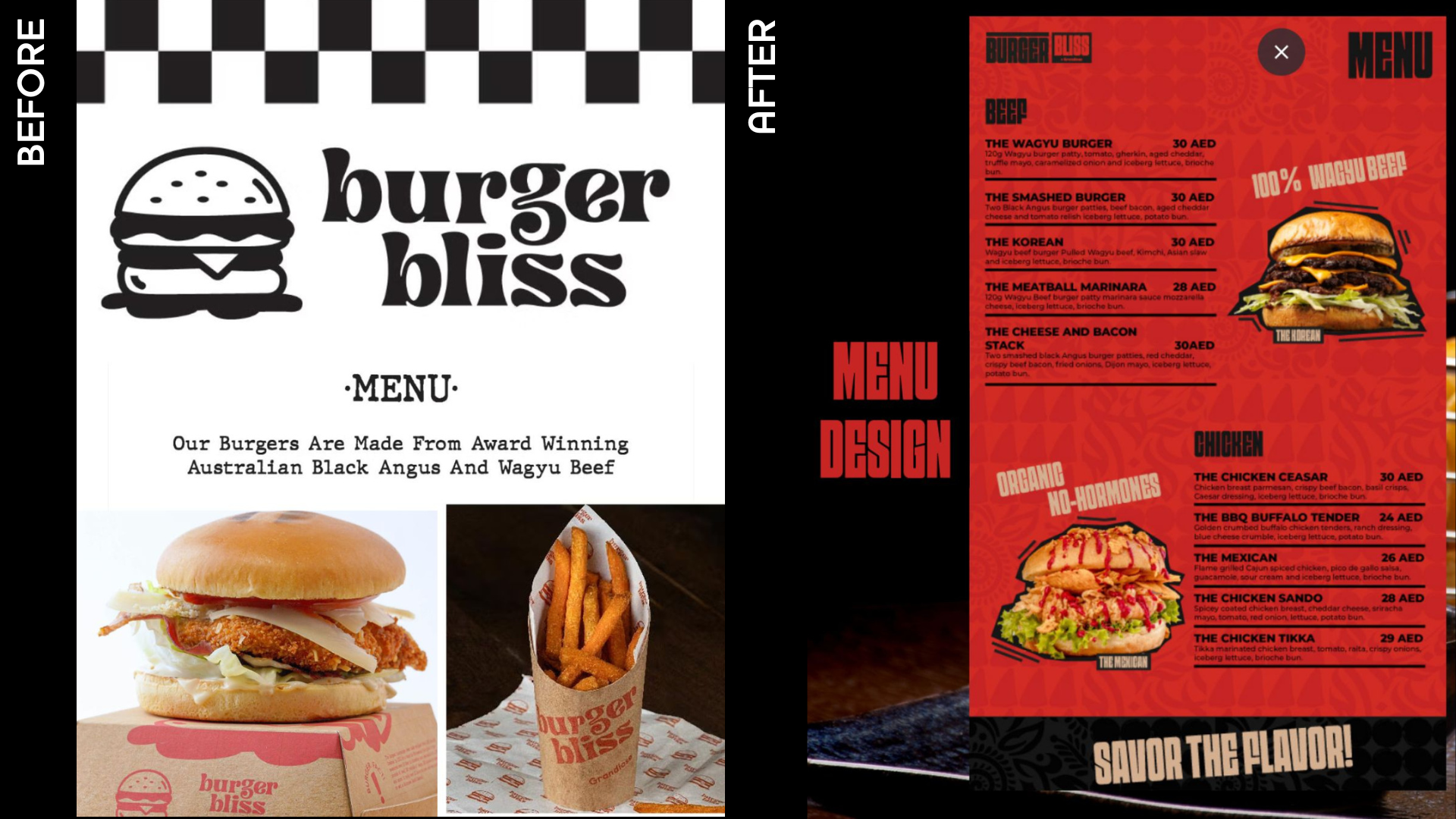 The menu redesign of Burger Bliss transforms it from a plain, generic burger brand into a bold, crave-inducing experience. The original black-and-white layout felt basic and lacked personality, while the new design uses rich reds, bold typography, and dynamic layouts to create energy, appetite appeal, and a strong brand identity. It clearly targets modern, urban food lovers with its confident tone, premium feel, and visually mouthwatering presentation.